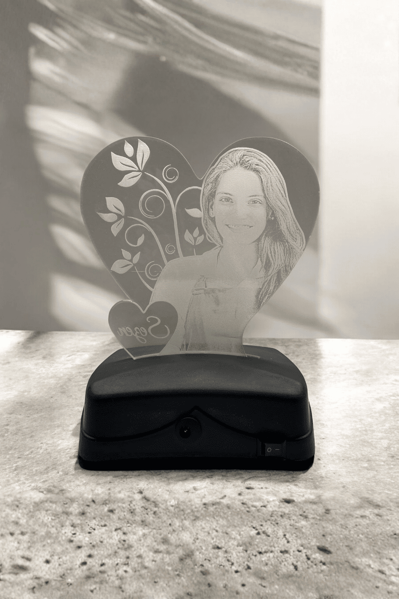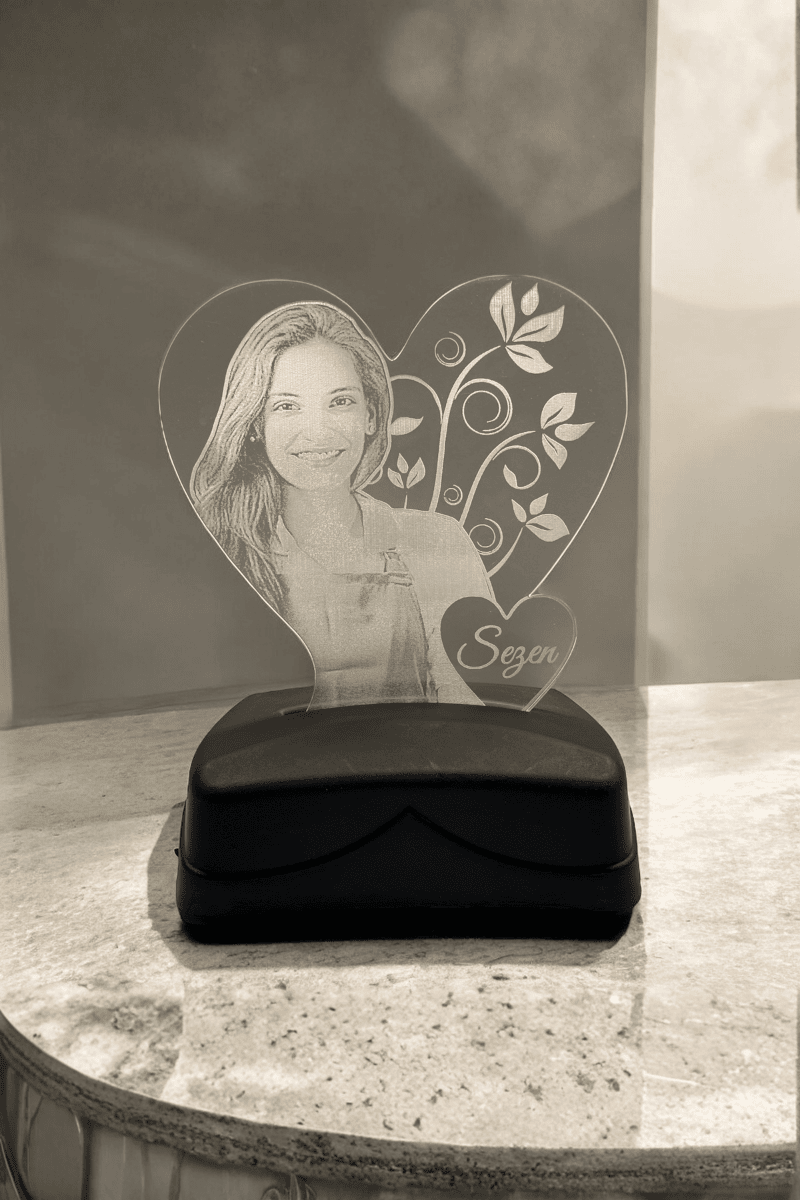 5 mm pleksiglass üzerine lazer işleme ile hazırlanır. Resim, isim, yazı ve tarih eklenerek tamamen size özel hale getirilir.