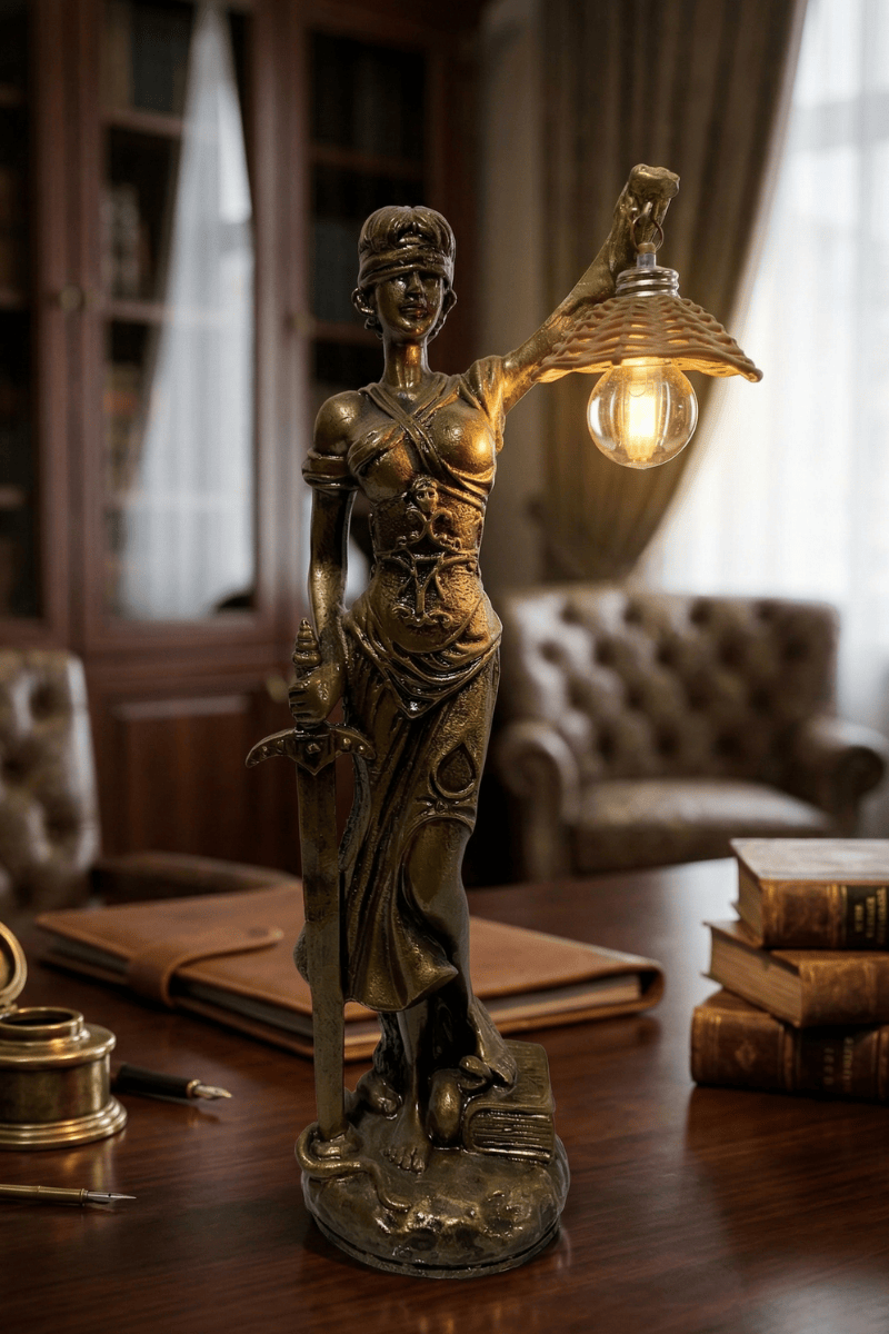 Adalet figüründen ilham alan zarif tasarımı ve ışıklı yapısıyla öne çıkan bu dekoratif masa lambası, bulunduğu ortama güçlü, seçkin ve karakterli bir hava kazandırır. Elinde kılıç taşıyan figür detayı ürüne klasik ve etkileyici bir duruş katarken, üst bölümde yer alan aydınlatma kısmı sıcak ışığıyla özellikle akşam saatlerinde dikkat çekici bir ambiyans oluşturur. Yalnızca bir aydınlatma ürünü değil, aynı zamanda dekoratif değeri yüksek özel bir obje olarak öne çıkar.