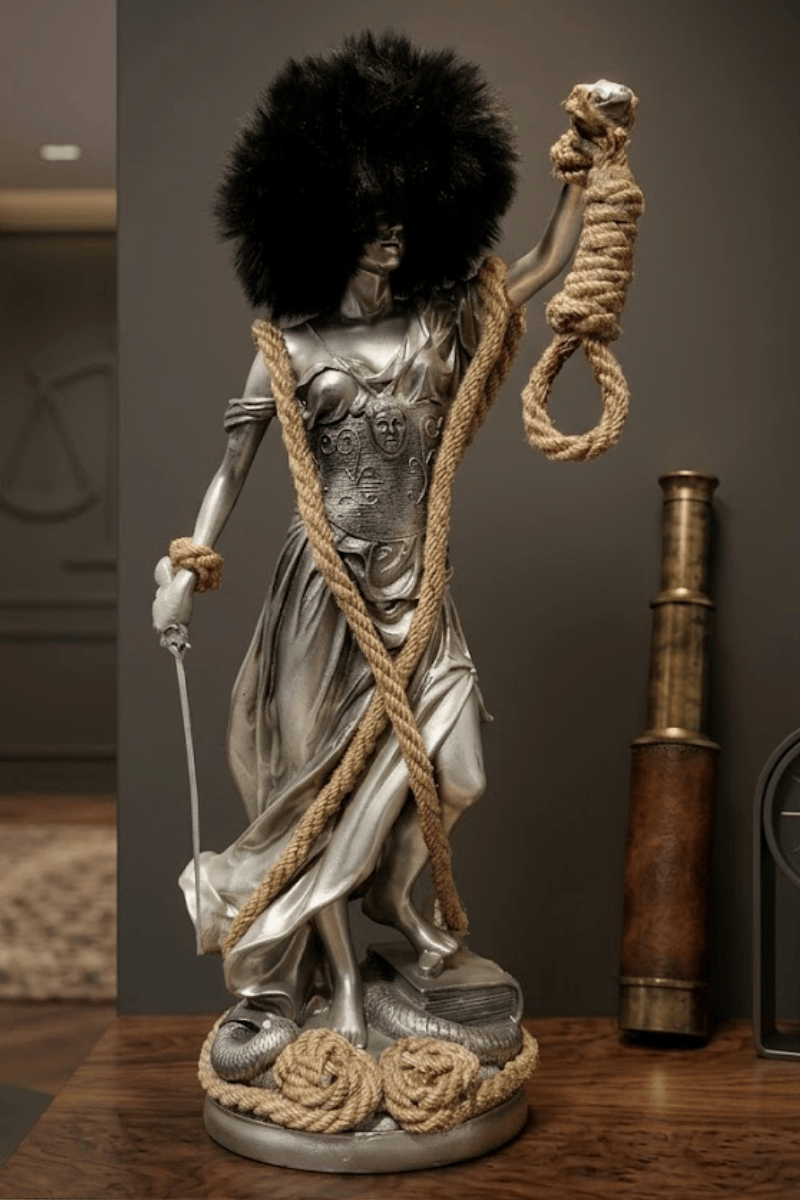 Hukukun evrensel temsilcisi Themis, poliresin malzemenin gümüş ışıltısı ve aykırı detaylarla birleştiği bu tasarımda, adaletin bazen ne kadar zorlu yollardan geçtiğini simgeliyor. Klasik figürün üzerine eklenen halat ve doku detayları, geleneksel heykel sanatına modern ve düşündürücü bir bakış açısı kazandırırken, ofis dekorasyonunuzda iddialı bir odak noktası oluşturur.