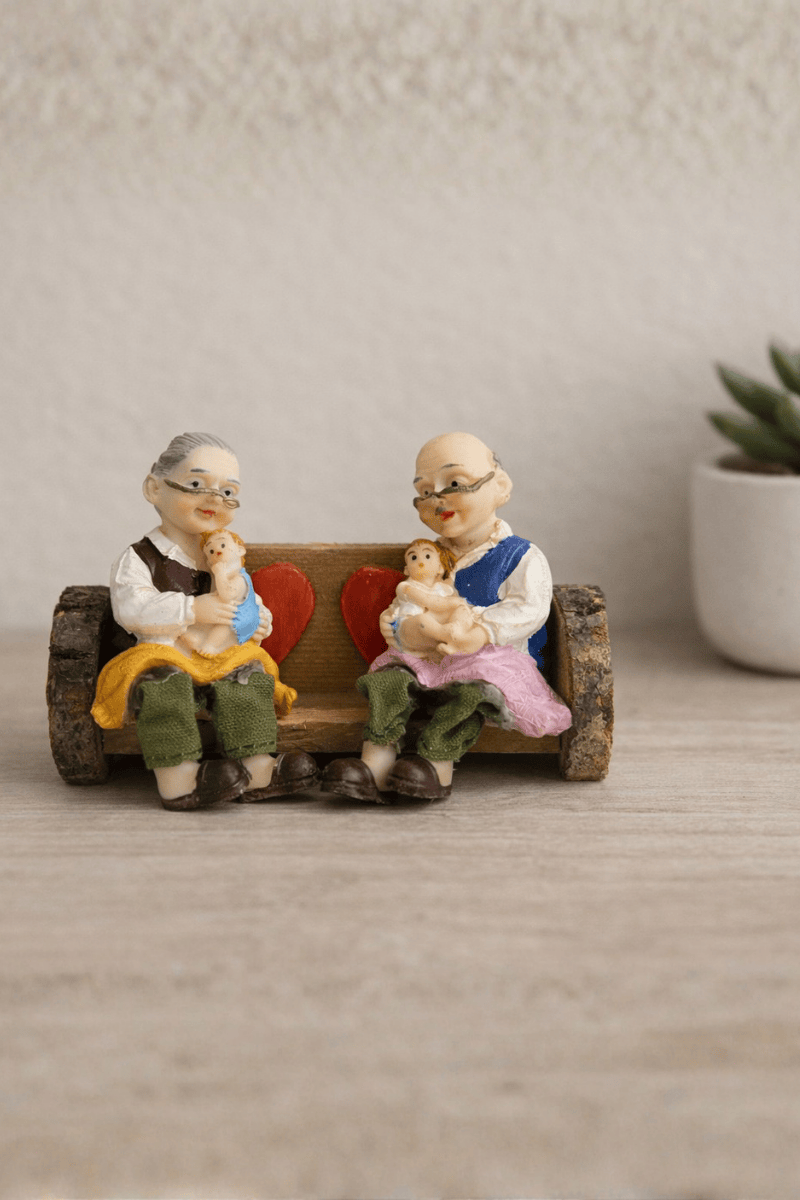 Ahşap bankta oturan yaşlı çift biblo paçalı