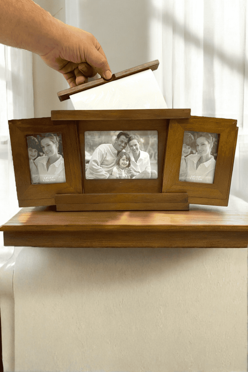 Ahşap çerçeve ve albüm, en değerli anıları şık ve kalıcı bir şekilde saklamak için hazırlanan özel bir tasarım olarak hazırlanmıştır.
