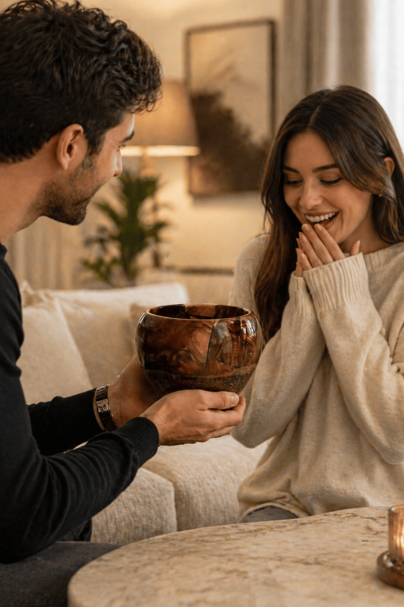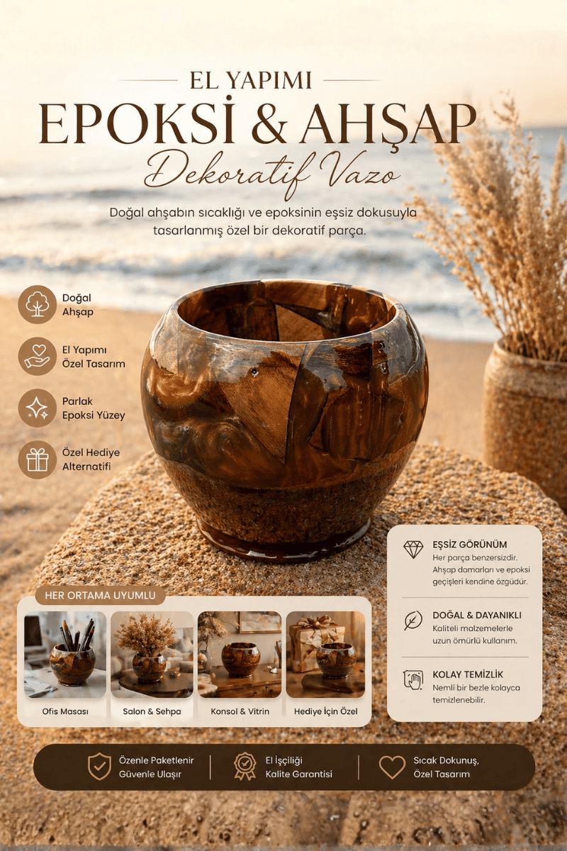 Her parça, ahşabın doğal damarları ve epoksinin kendine özgü geçişleri sayesinde benzersizdir. Sıradan dekoratif ürünlerden farklı, doğal malzeme hissi taşıyan ve hediye edildiğinde anlamı olan özel bir tasarımdır.