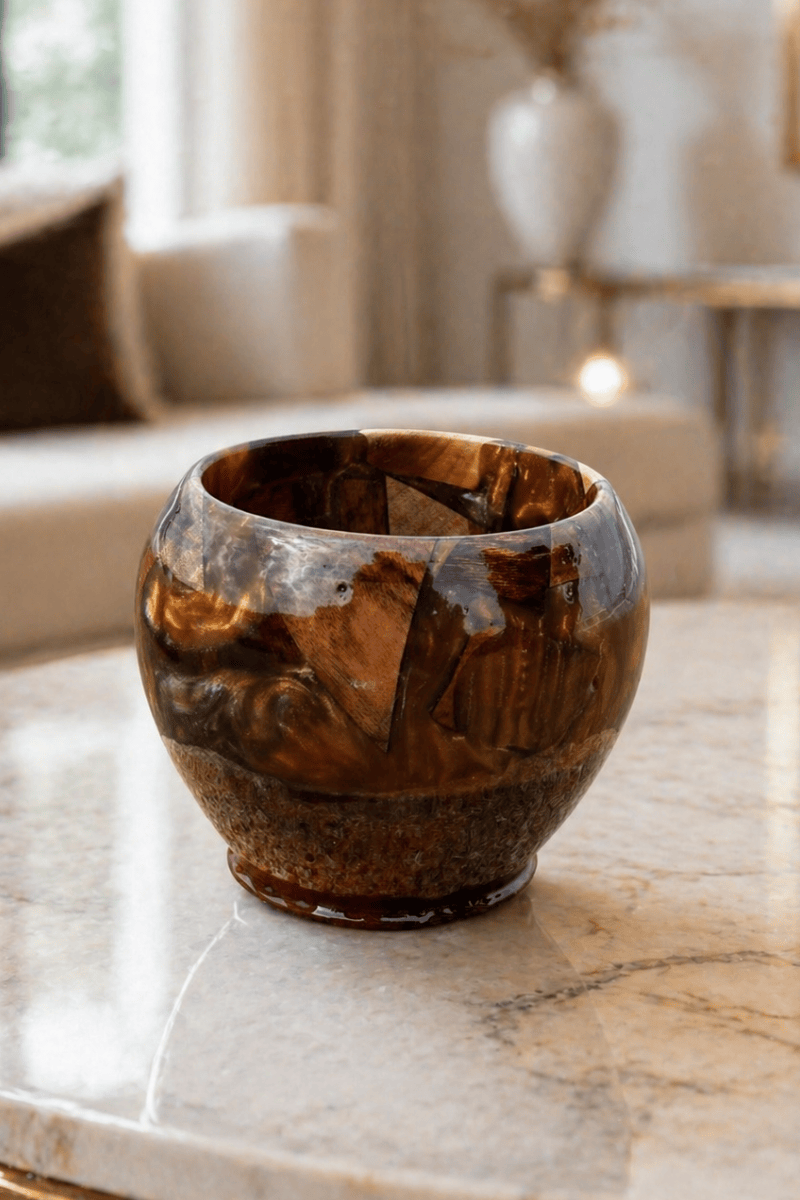 Doğal ahşabın sıcak dokusu ile amber tonlu epoksinin parlak ve derin görünümünü bir araya getiren bu dekoratif masaüstü obje, bulunduğu ortama özel bir karakter kazandırır.