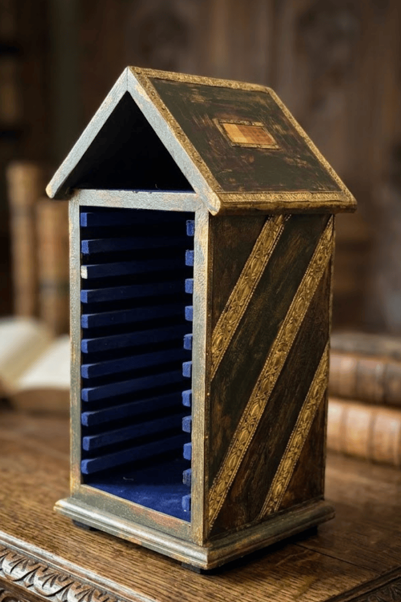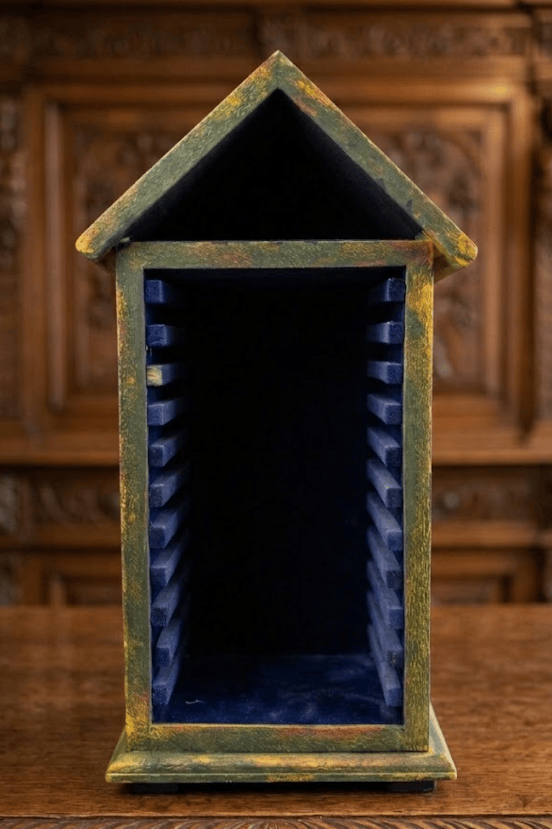 Kütüphane odaları, çalışma masaları veya raflarda değerli objeleri sergilemek için ideal olan bu obje, iç kısmındaki 10 adet derin mavi kadife bölmesi ve özenli el boyama işçiliğiyle dikkat çeker. Antika meraklıları ve koleksiyonerler için eşsiz bir parça, sevdikleriniz için ise hem işlevsel hem de estetik değeri yüksek, prestijli ve huzur veren dekoratif bir hediye seçeneğidir.