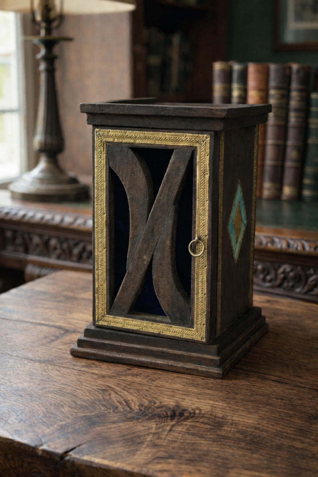 Antik kitapların vakur duruşunu ve tarihi kütüphanelerin asil ruhunu çalışma masanıza taşıyan bu el yapımı masaüstü organizer ve kutu düzenleyici, nostaljik eskitme detaylarını sofistike bir tasarım anlayışıyla buluşturuyor. Koyu ahşap tonları ve altın sarısı antik bezemelerle karakterize edilen dış yüzey; yan taraflardaki geometrik kakmalar ve klasik hatlarla zenginleştirilmiş, yaşanmışlık hissi veren koleksiyonluk bir kompozisyon sunar.