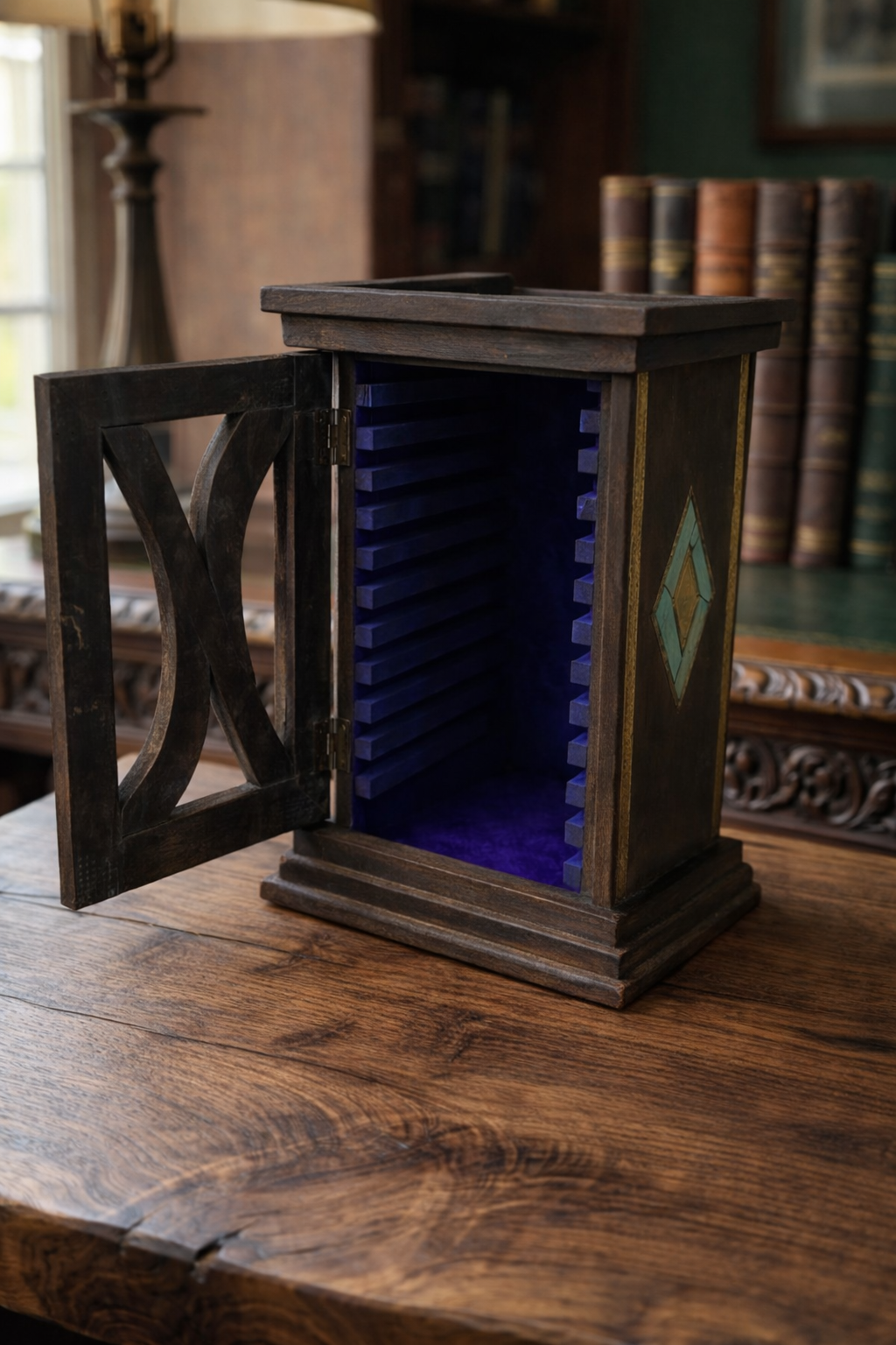 Ofis masanızda özel eşyalarınızı, not kartlarınızı veya küçük hediyelerinizi düzenli bir şekilde saklamak veya sergilemek için ideal olan bu obje, iç kısmındaki on beş adet derin mor kadife bölmesi ve özenli el boyama işçiliğiyle dikkat çeker. Prestijli bir çalışma ortamı yaratmak isteyenler için eşsiz bir parça, sevdikleriniz için ise hem işlevsel hem de estetik değeri yüksek, profesyonel bir hediye seçeneğidir.