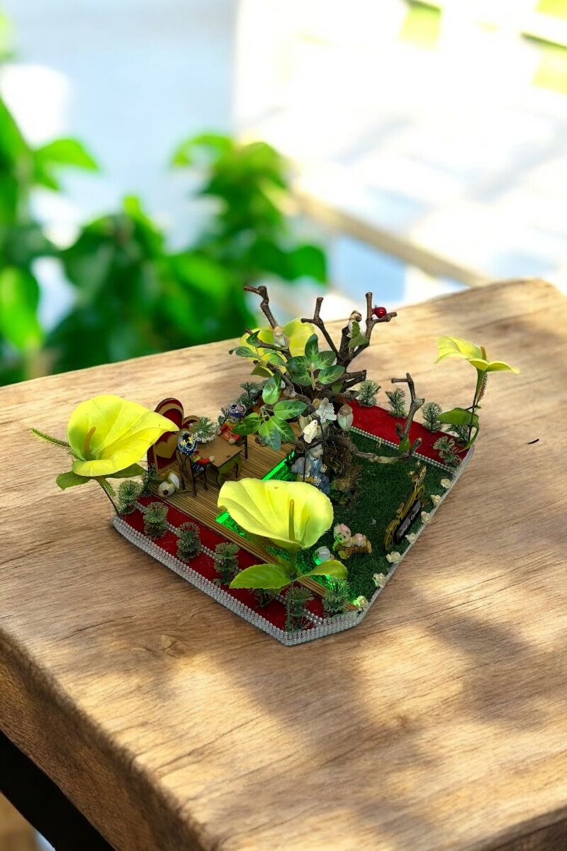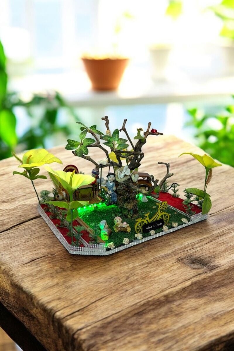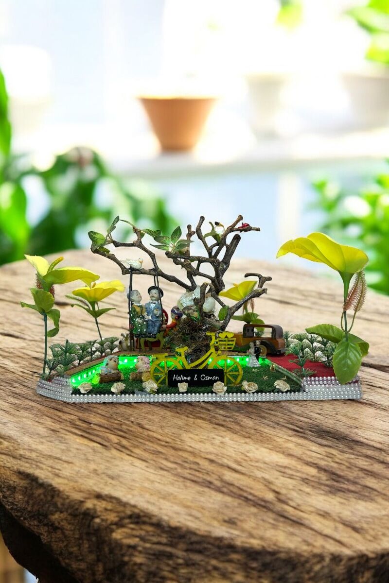 Bu bahçeli özel tasarım, minyatür bahçe konseptiyle hazırlanmış sıcak ve anlamlı bir dekoratif üründür.