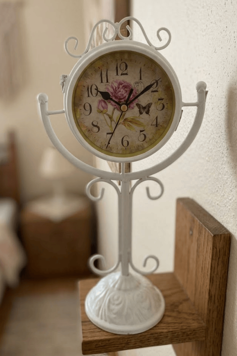 Ferforje sanatının zarafetini vintage bir ruhla buluşturan bu dekoratif masa saati, yaşam alanlarınıza nostaljik bir dokunuş katar. Beyaz metal gövdesi üzerindeki kıvrımlı detaylar ve klasik kaide yapısı, çift taraflı saati sadece bir zaman ölçer olmaktan çıkarıp seçkin bir aksesuar haline getirir.