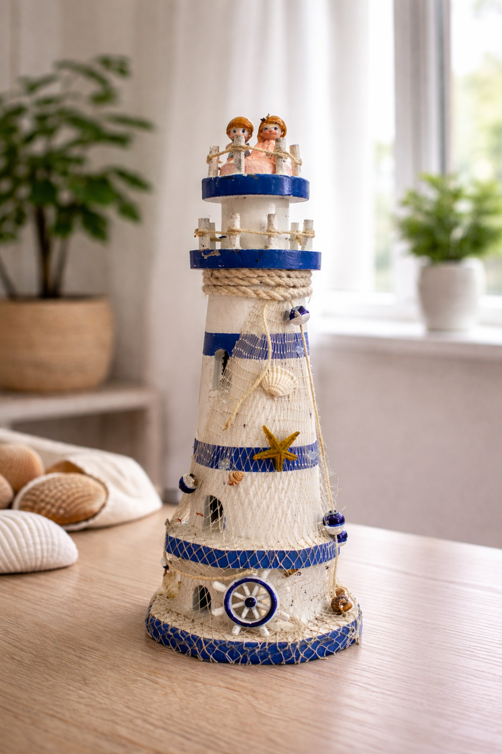 Deniz esintisini ve sahil kasabalarının dingin ruhunu dekorasyonunuza taşıyan bu el yapımı deniz feneri biblosu, Ahşap malzemenin dayanıklılığını marin detaylarla buluşturuyor. Mavi ve beyazın karakteristik uyumuyla boyanan tasarım; üzerindeki balıkçı ağı, deniz yıldızı, deniz kabukları ve dümen figürleriyle zenginleştirilmiş sahil temalı bir kompozisyon sunar.