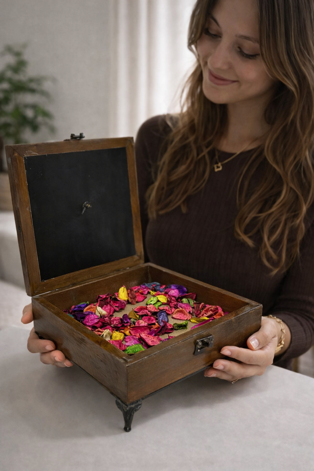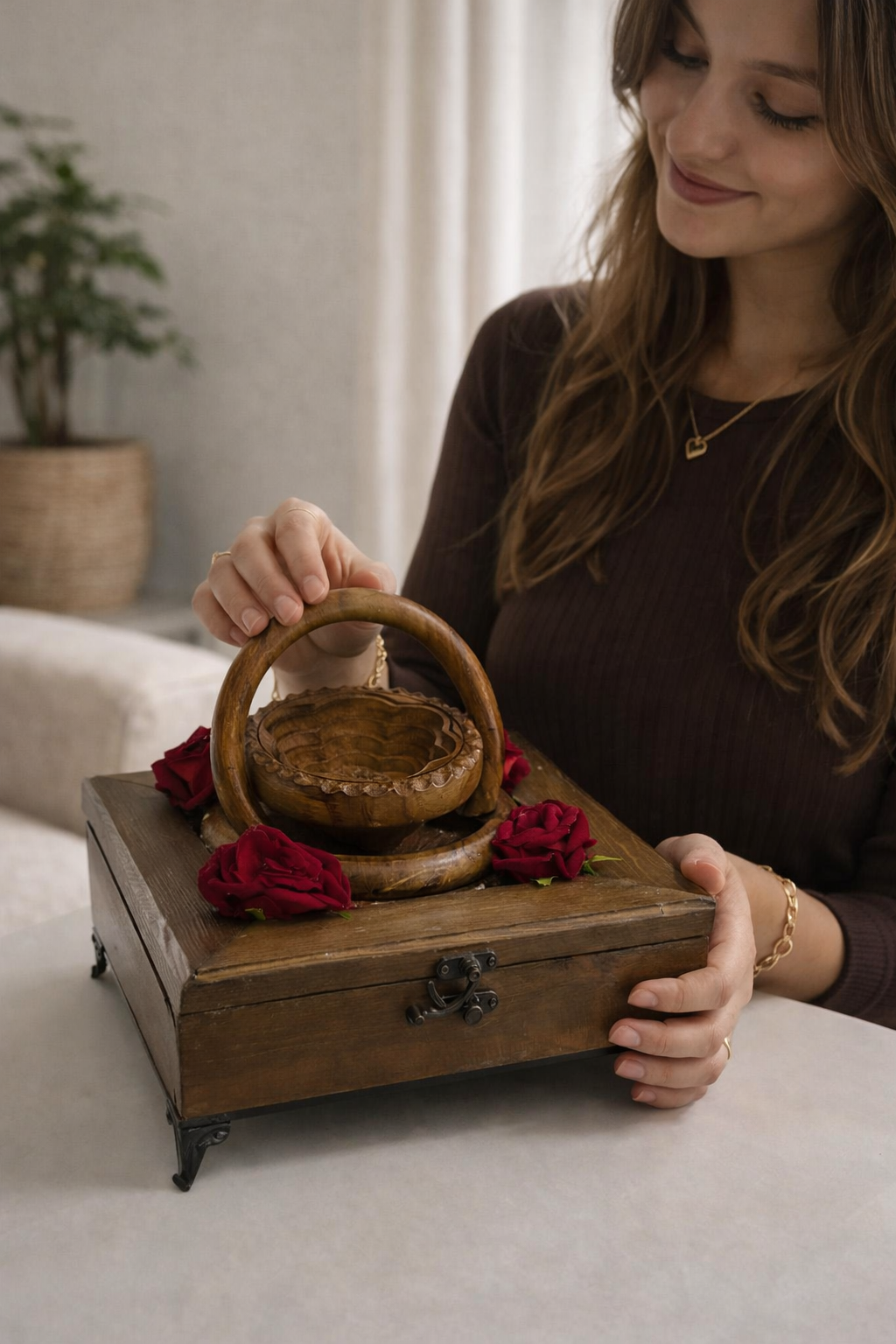 Aşkın ve sadakatin en zarif sembolü olan gülleri, el emeği ahşabın doğal sıcaklığıyla birleştirdik. Gündüzleri masanızda veya rafınızda asil bir duruş sergileyen bu ayaklı ahşap kutu, üzerindeki el oyması minyatür sepeti saran tutkulu kırmızı gülleriyle, sevginin asla solmayacak bir karesi gibi durur.