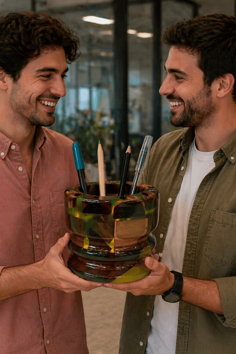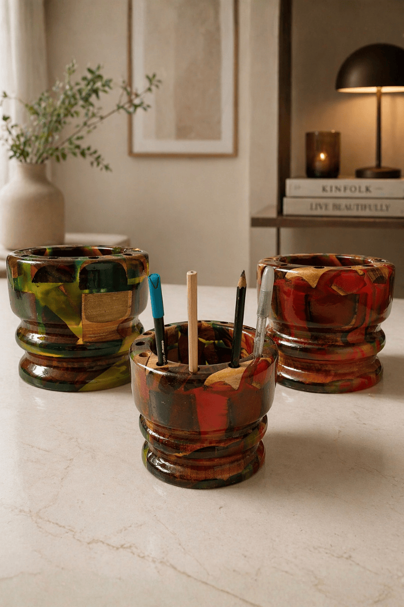 Kalem, fırça, makas, küçük ofis gereçleri veya kişisel eşyalar için kullanılabilen bölmeli yapısı sayesinde masa üzerinde dağınıklığı azaltırken, parlak epoksi yüzeyi ve ahşabın doğal damarlarıyla dikkat çekici bir görünüm sunar.
