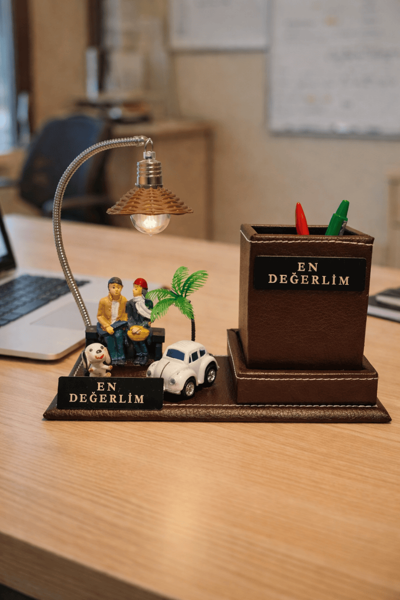 Işıklı masaüstü kalemlik, hem kullanışlı yapısı hem de duygusal detaylarıyla çalışma alanına sıcaklık katan özel bir tasarım olarak hazırlanmıştır.