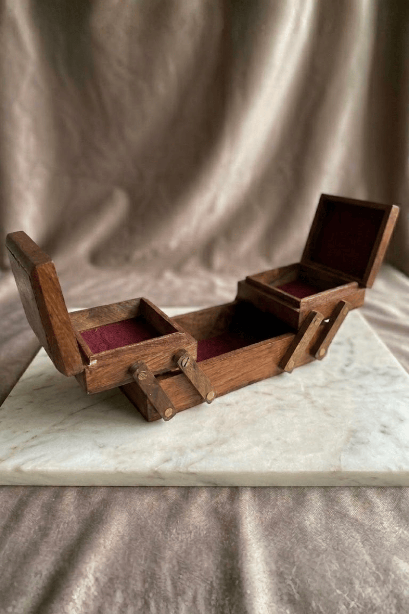 Kademeli açılan akordeon mekanizması sayesinde takılarınız, dikiş malzemeleriniz veya küçük koleksiyon parçalarınız için üç ayrı bölme sunan bu obje; iç kısımdaki bordo kadife astarı ve pirinç detaylı bağlantı aparatlarıyla dikkat çeker. Hem düzenleyici bir saklama ünitesi hem de dekoratif bir aksesuar olarak kullanmak için ideal olan bu parça, el emeğine değer verenler için eşsiz bir seçim, sevdikleriniz için ise ömür boyu saklanacak işlevsel ve şık bir hediye seçeneğidir.