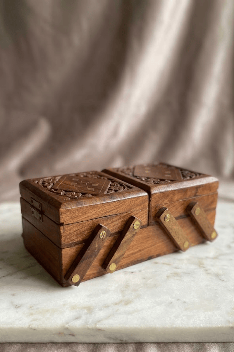 Geleneksel zanaatkarlığın işlevsel bir mühendislikle buluştuğu bu el yapımı açılır kapanır ahşap takı ve dikiş kutusu, doğal masif ahşabın sıcaklığını nostaljik bir kullanım deneyimiyle sunuyor. Ceviz tonlarının derinliğini taşıyan dış yüzey; kapaklarındaki titizlikle işlenmiş çiçek motifli oymalar ve geometrik hatlarla zenginleştirilmiş, rustik bir estetik sergileyen sanatsal bir kompozisyon sunar.