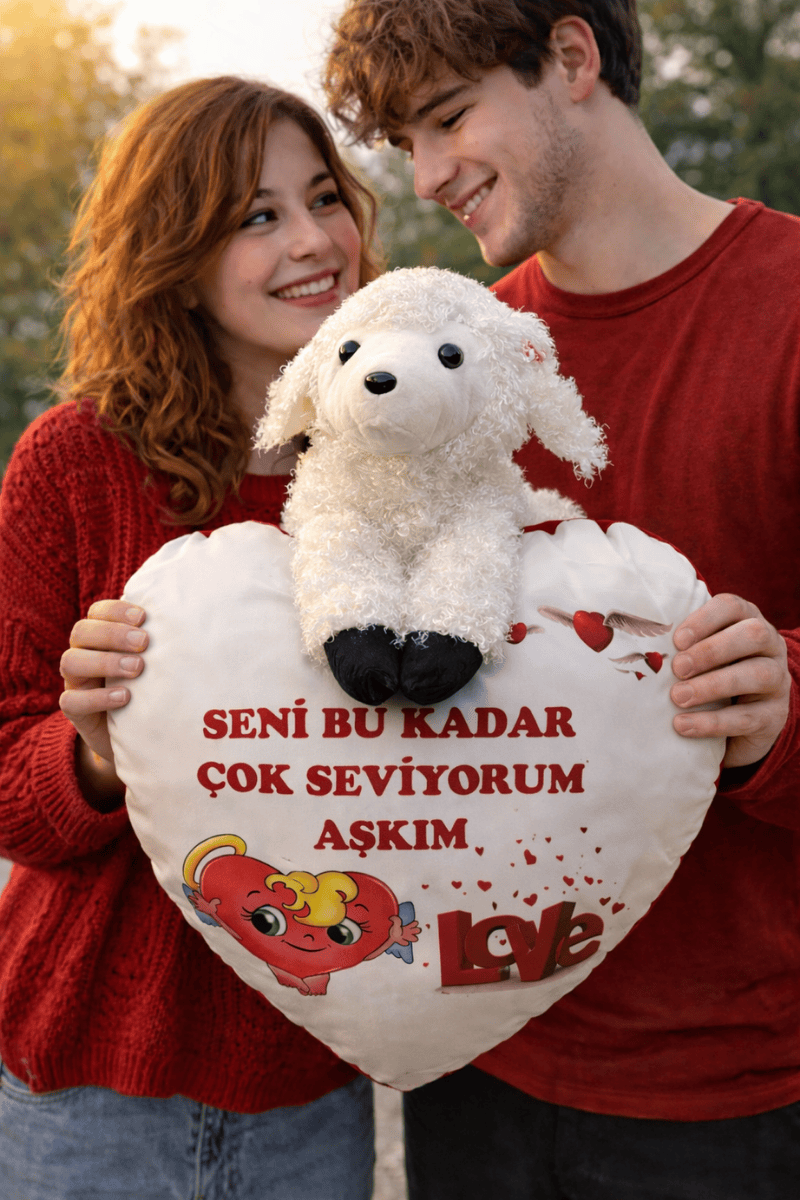 Sevgiyi tatlı ve samimi bir sürprizle ifade etmek isteyenler için hazırlanmış bu peluş hediye seti, tek parçada hem duyguyu hem de sevimli bir görünümü bir araya getirir. Üzerinde mesaj baskısı bulunan kalp yastık ve üst kısmında yer alan peluş kuzu figürüyle, romantik anlara sıcaklık katan anlamlı bir hediye alternatifi sunar. İlk anda dikkat çeken tasarımı sayesinde özel günlerde unutulmaz bir etki bırakır.