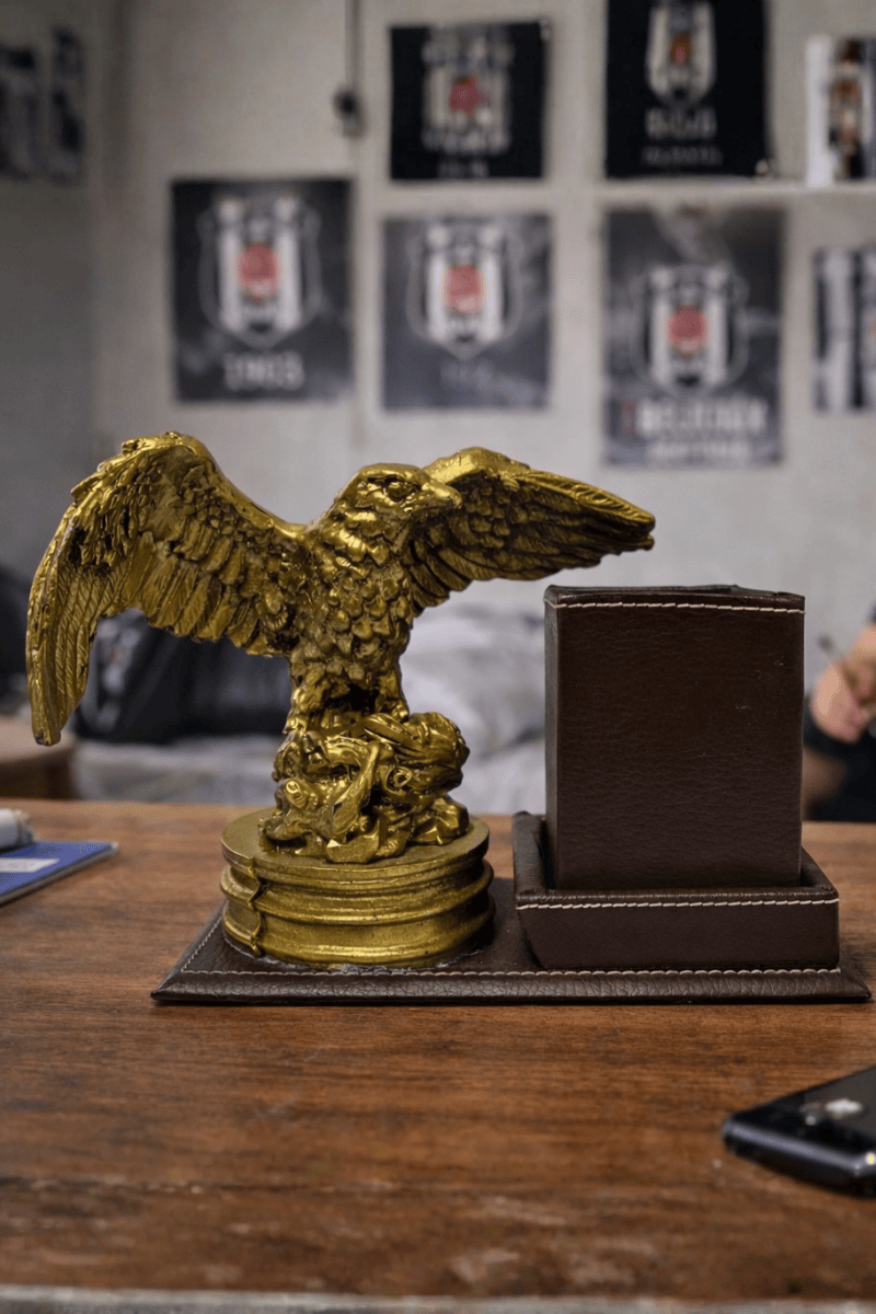 Güçlü duruşu ve dikkat çeken kartal figürüyle öne çıkan bu masaüstü kalemlik, çalışma alanına yalnızca düzen değil, karakter de kazandırır. Yan bölümde yer alan kalemlik alanı günlük kullanımda pratik bir düzen sunarken, altın tonlu kartal detayı ürüne daha iddialı ve prestijli bir görünüm katar. Özellikle ofis masasında, çalışma köşesinde ya da yönetici masasının üzerinde fark yaratan dekoratif bir tamamlayıcı olarak öne çıkar.