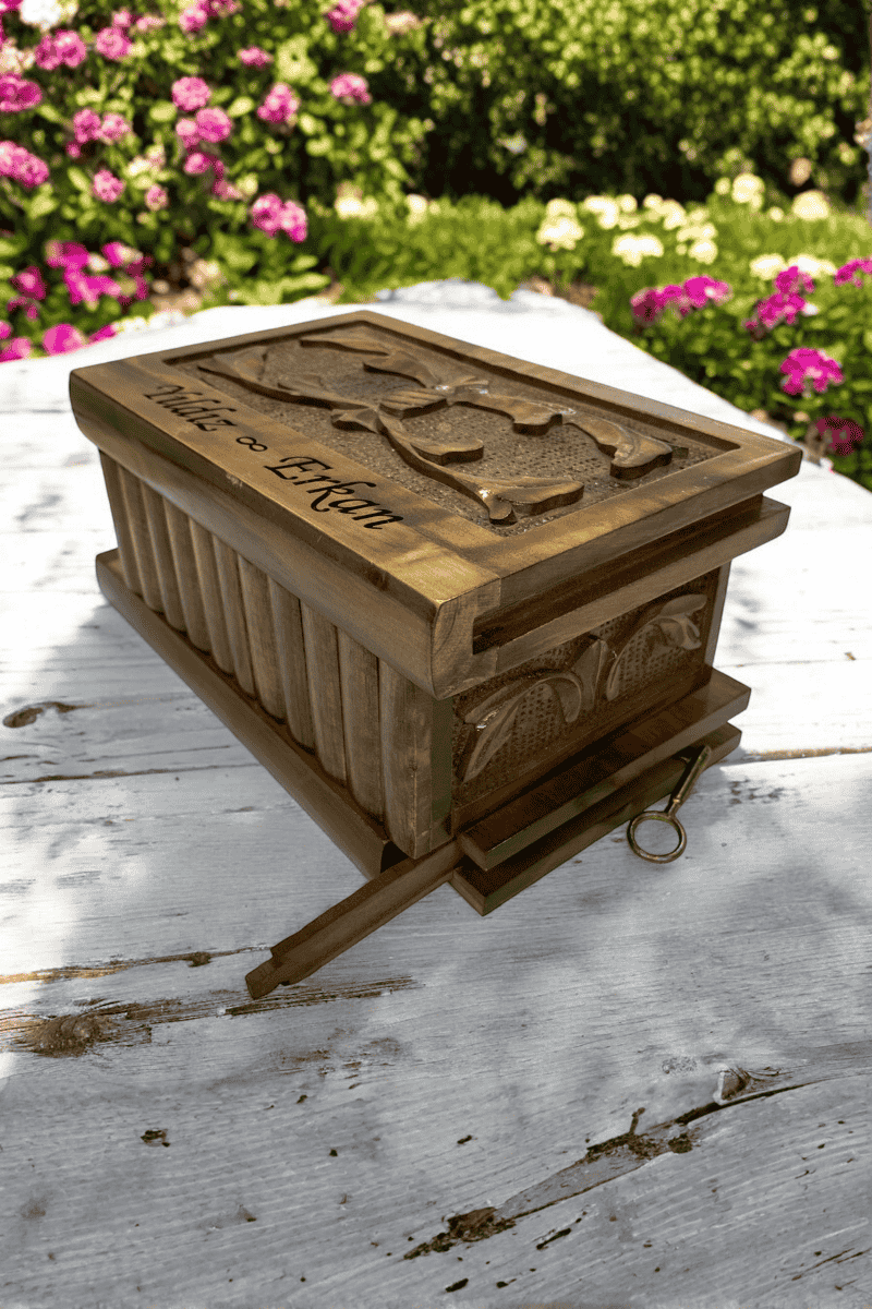 Kilitli Ceviz Ahşap Sandık Kişiye Özel, en özel eşyaları ve en değerli hatıraları şık bir sunum içinde saklamak isteyenler için hazırlanmış özel bir tasarımdır.