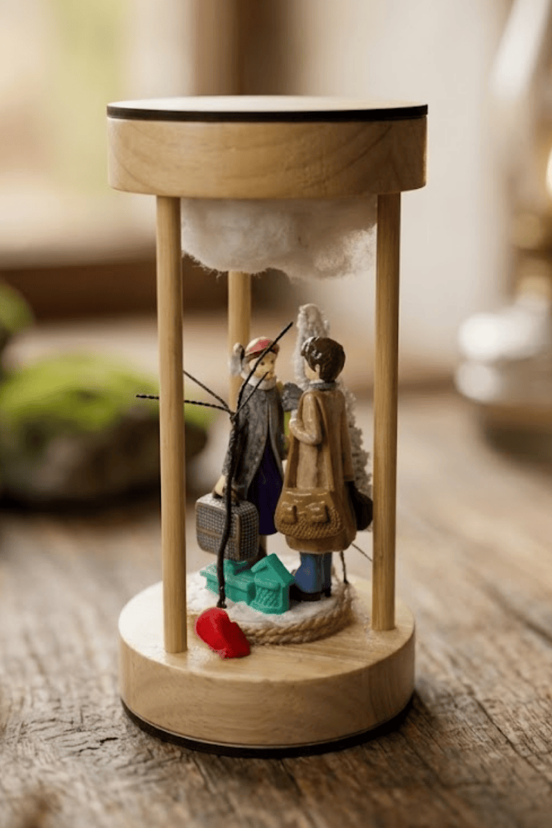 Kış masalı temalı minyatür figürlerin nostaljik bir atmosferle buluştuğu bu özel tasarım, soğuk kış günlerinin sıcak hatıralarını yaşam alanlarınıza taşıyor. Ahşap kaide ve sütunlar arasında kurgulanan sahnede; bavullarıyla yolculuğa hazırlanan çift figürleri ve tepedeki bulut detayı, dondurulmuş bir zaman dilimini andıran masalsı bir görsellik sunar.