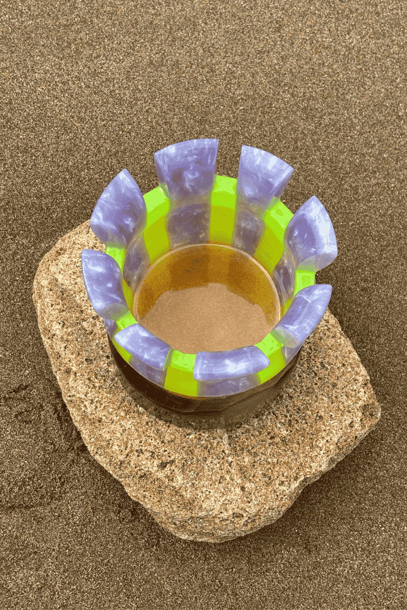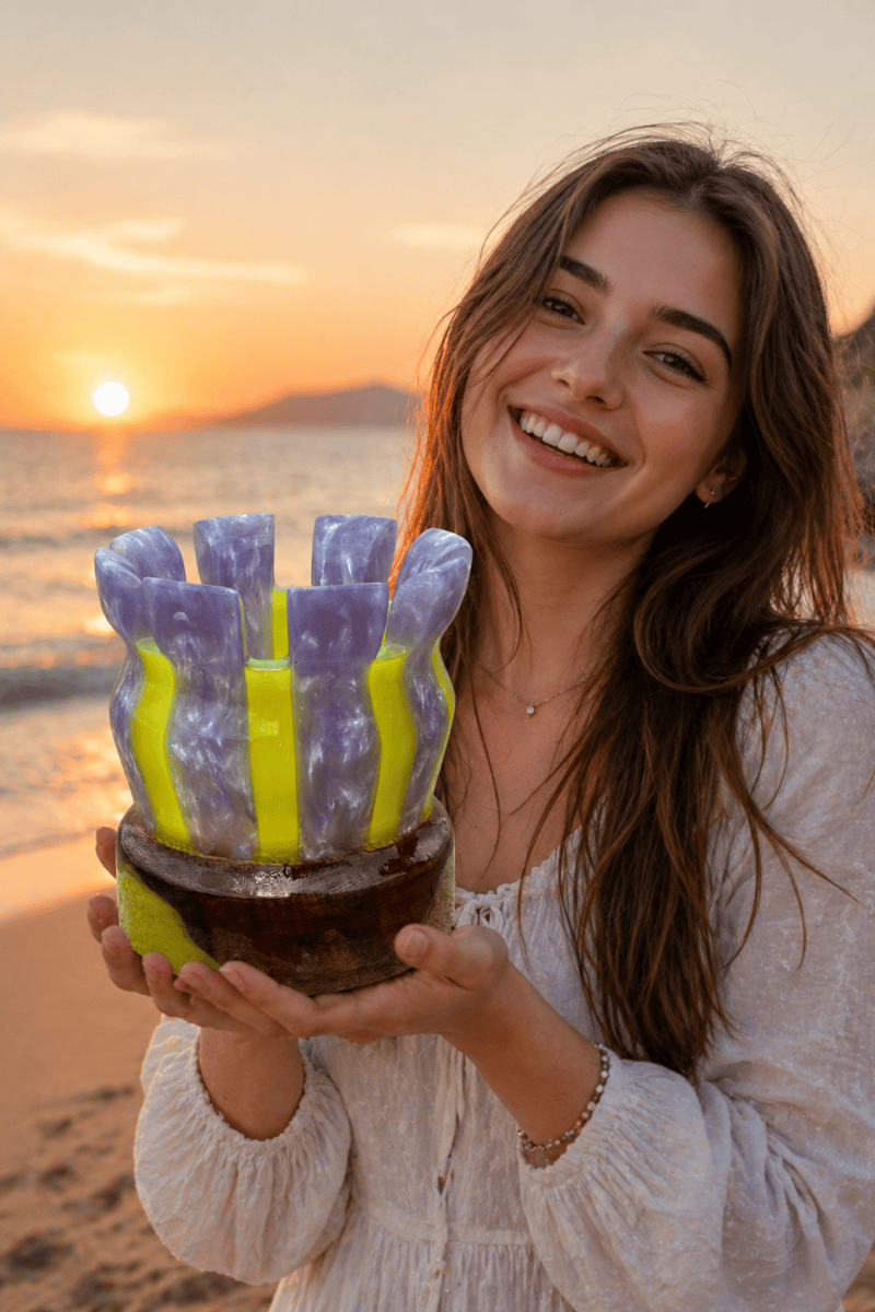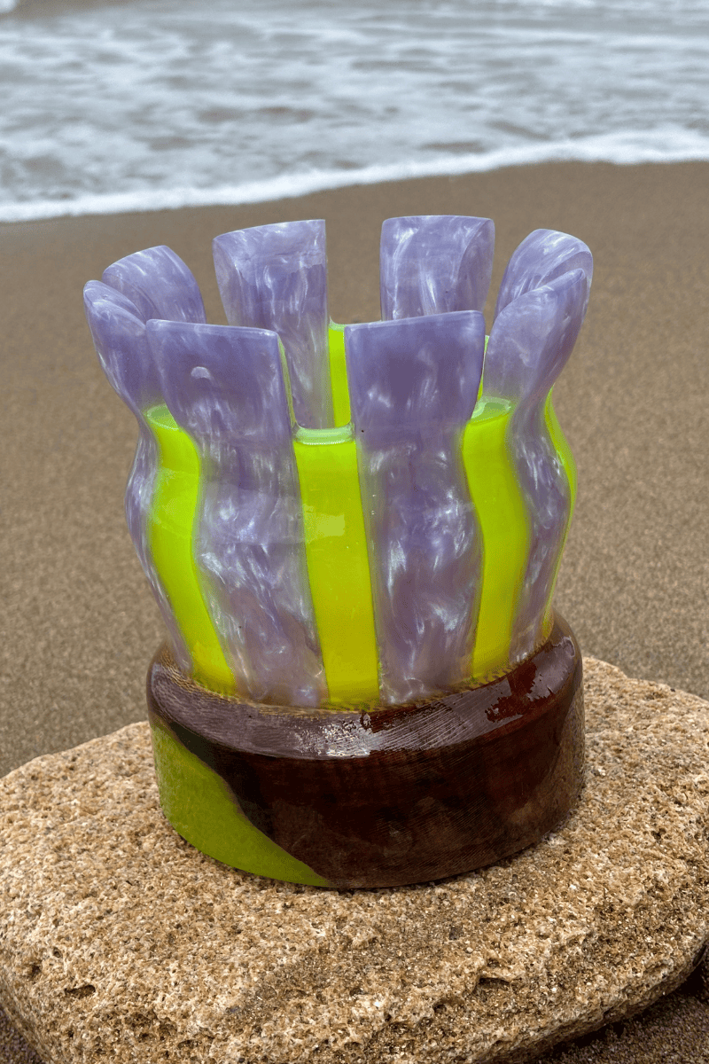 Lila sedef görünümlü yüzeyi, canlı yeşil epoksi detayları ve doğal ahşap tabanıyla dikkat çeken bu özel tasarım masaüstü vazo, bulunduğu ortama enerjik ve sanatsal bir dokunuş kazandırır.