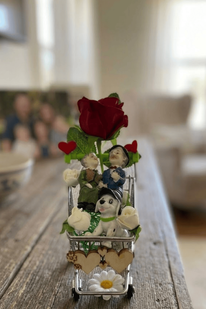 Hediye Müzesi atölyesinde, "birlikte yaşlanmanın" en keyifli halini yansıtmak için hazırlanan bu objede; şık kıyafetleri içindeki yaşlı çiftimiz, sadık köpekleri ve onları gölgeleyen bir kırmızı gül ile masalsı bir yolculuğa çıkıyor. Market arabasının önündeki ahşap kalplere isim yazılma detayı ve etrafını süsleyen zarif beyaz çiçekler, bu "sevgi sepetini" tamamlayan en şık dokunuşlar. İster çalışma masanızda yüzünüzü güldürecek bir aksesuar, ister sevdikleriniz için "ömür boyu yanındayım" mesajı veren unutulmaz bir hediye... Bu özgün parça, sevgiyi klasik kalıpların dışına çıkarıp modern ve eğlenceli bir formla sunmanız için tasarlandı.