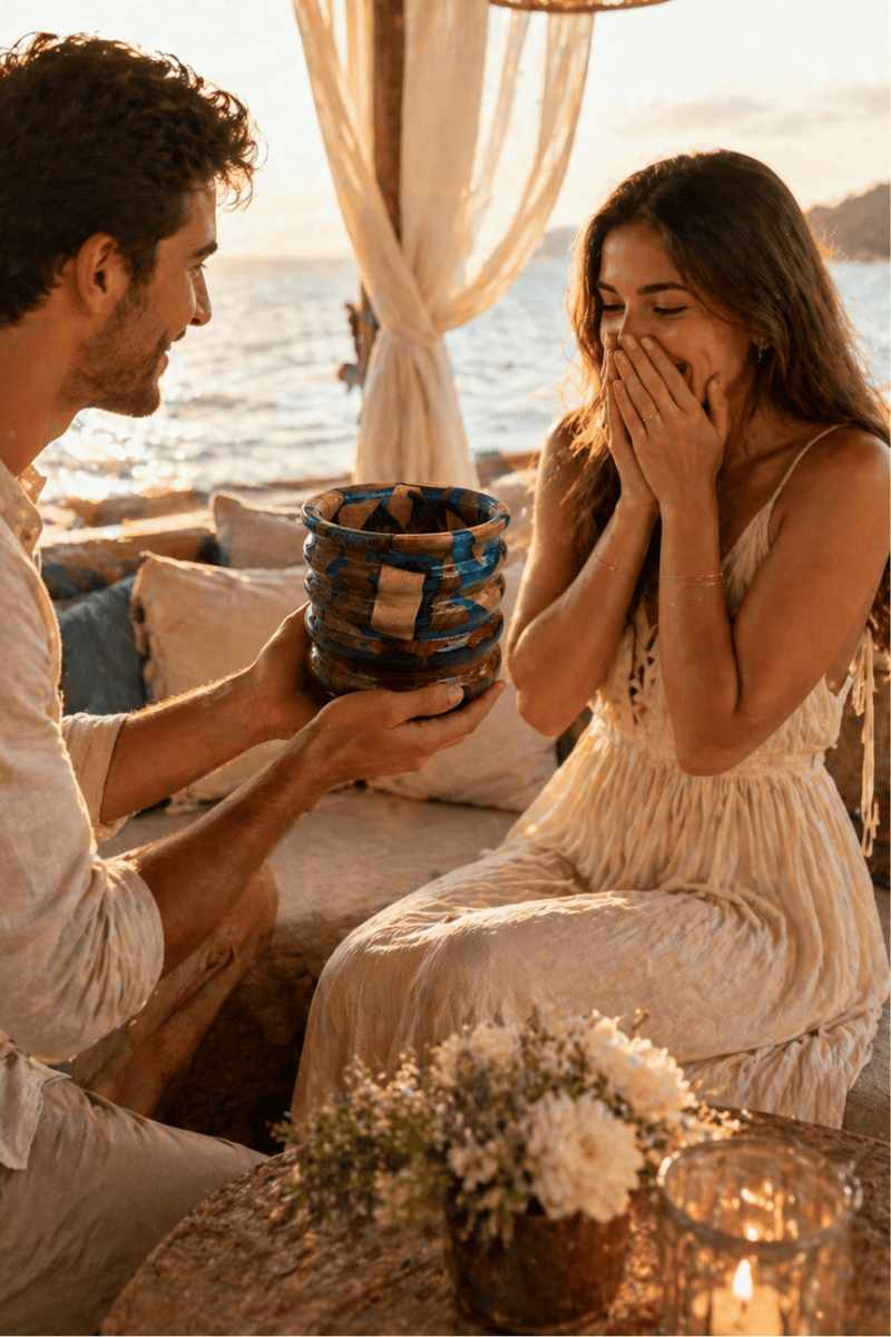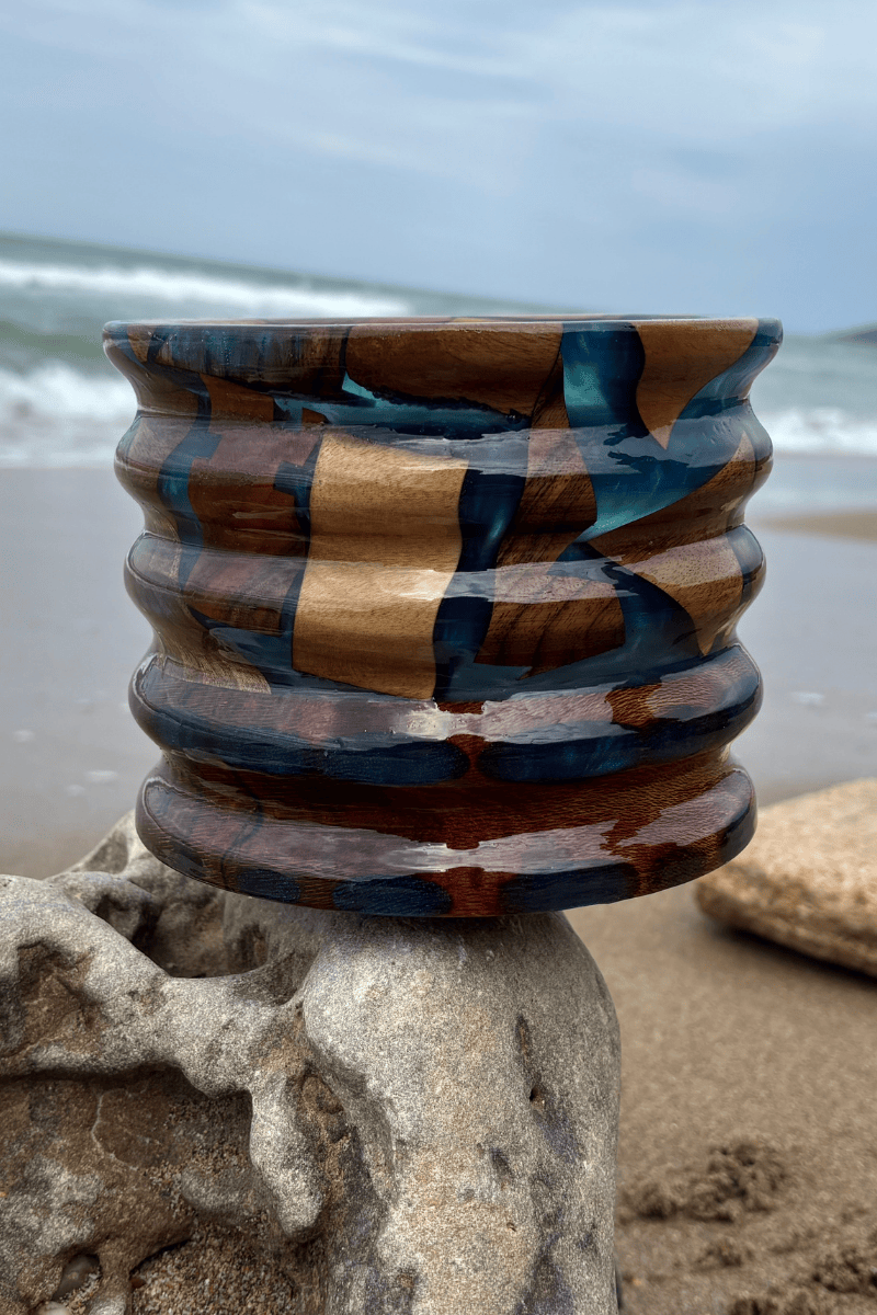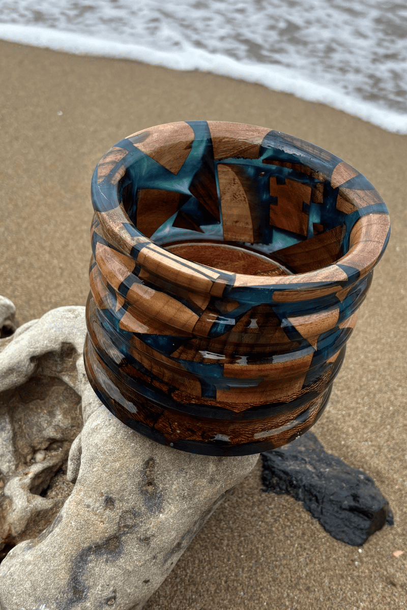 Doğal ahşabın sıcak dokusu ile mavi epoksinin ferah ve dikkat çekici görünümünü bir araya getiren bu dekoratif vazo, bulunduğu ortama özel ve sanatsal bir karakter kazandırır.
