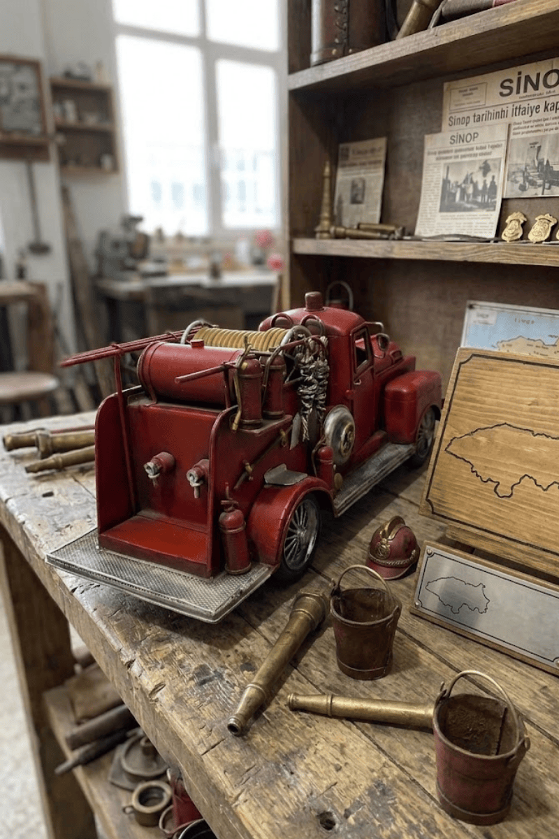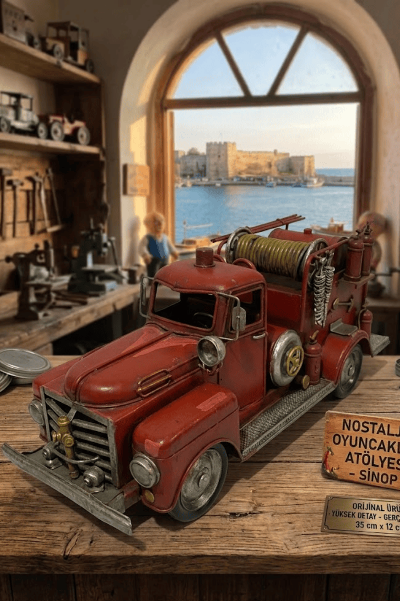 Metal itfaiye aracı, nostaljiyi ve karakterli dekor anlayışını bir araya getiren özel bir tasarım olarak hazırlanmıştır.