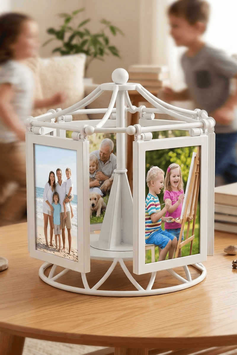 Anıları tek bir çerçevede toplamak yerine hareketli ve daha özel bir sunumla sergilemek isteyenler için tasarlanan bu müzikli dönen çerçeve, duyguyu dekoratif bir şıklıkla buluşturur. Kurmalı yapısı sayesinde çalıştığında hem müzik çalar hem de yavaşça dönerek her fotoğrafın ayrı ayrı görünmesini sağlar. Altı adet fotoğraf alanı ile aile karelerini, çocukluk anılarını, özel günleri ya da en sevilen hatıraları tek bir tasarımda bir araya getirme imkânı sunar.