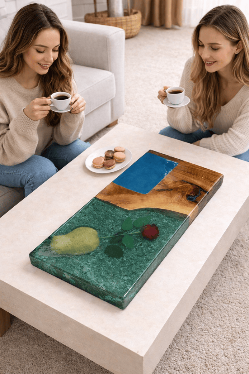 Ceviz ağacının ağırbaşlı dokusunu, dondurulmuş bir anı andıran epoksi sanatı ile birleştiren bu sunum tepsisi, sofralarınıza masalsı bir derinlik katar. İçerisine özenle yerleştirilen gül ve ceviz ağacı figürleri, yeşilin ve mavinin huzur veren tonlarıyla birleşerek epoksinin berraklığı altında üç boyutlu bir tablo estetiği sunar.