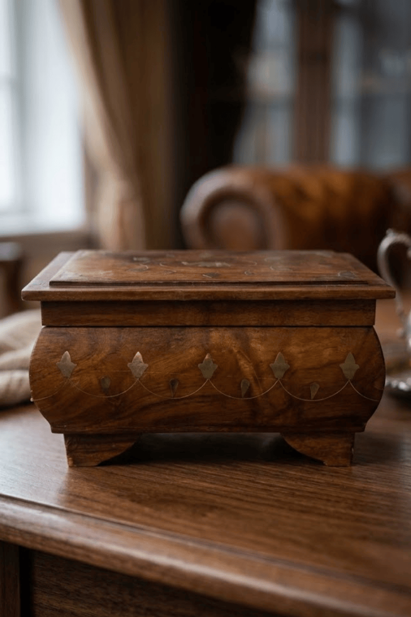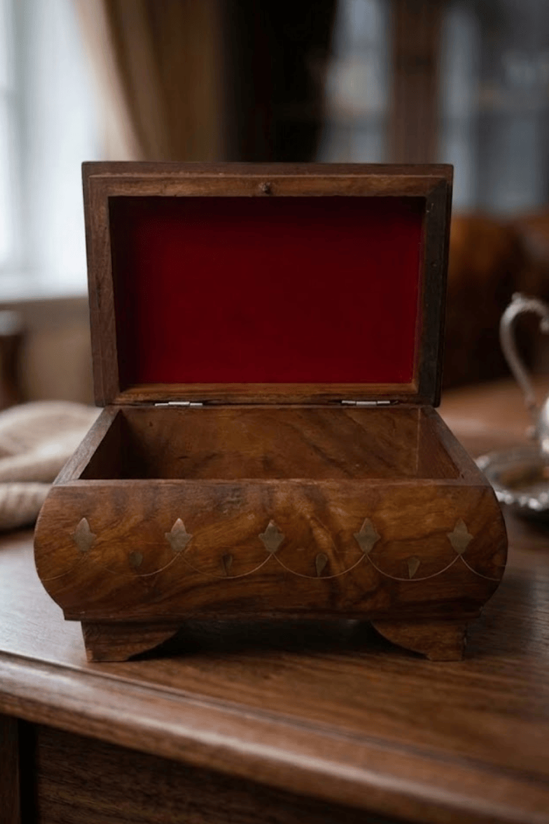 Gözden ırak ama kalbe yakın, en özel anılarınızı ve değerli eşyalarınızı muhafaza etmek için geçmişin asaletini günümüze taşıyan bir tasarım... Gündüzleri çalışma masanızda veya şifonyerinizde, zengin ahşap dokusu ve el oyması kavisli gövdesiyle duruşu asil bir dekoratif obje olarak dikkat çeker. Ön yüzünde ve kapağında yer alan zarif, yaprak motifli pirinç kakma işlemeleri, el emeğinin sıcaklığını ve kalıcılığını simgeler.