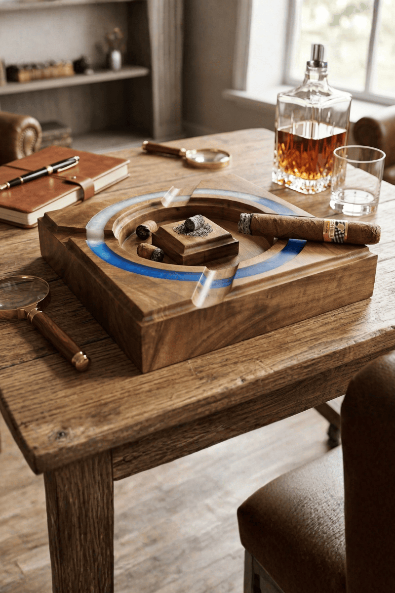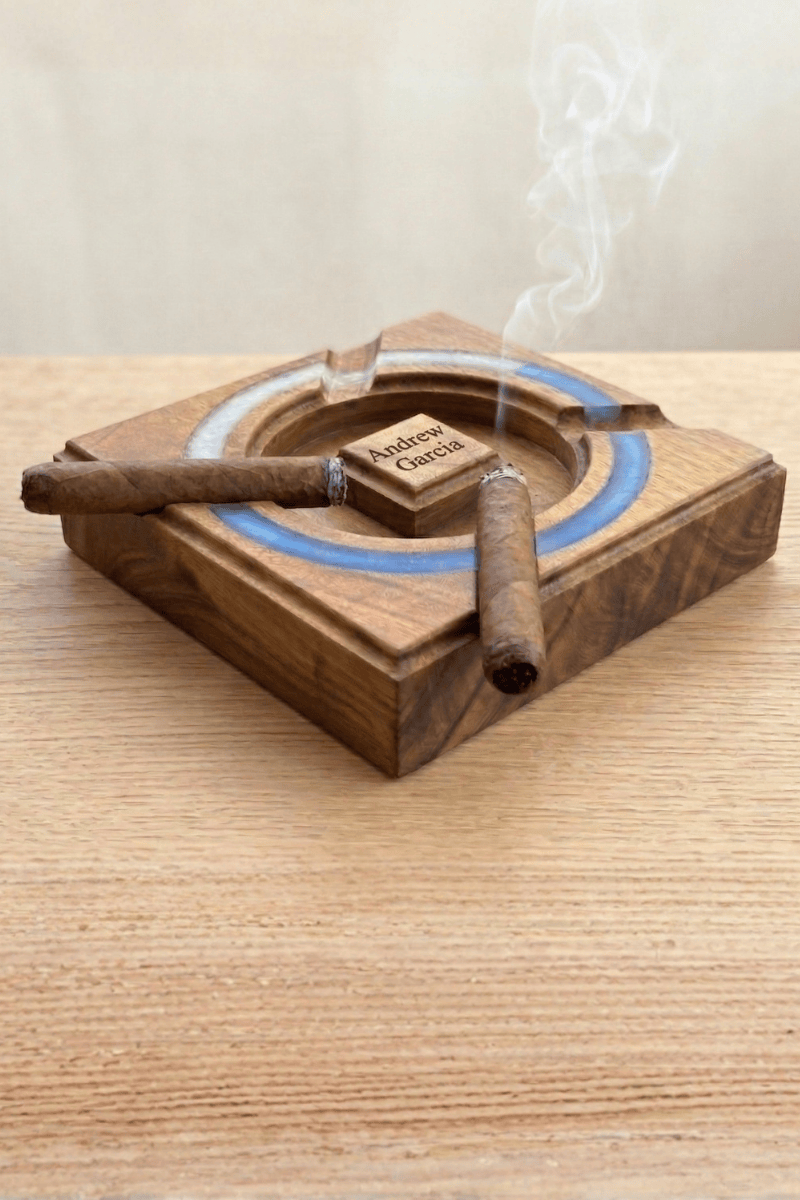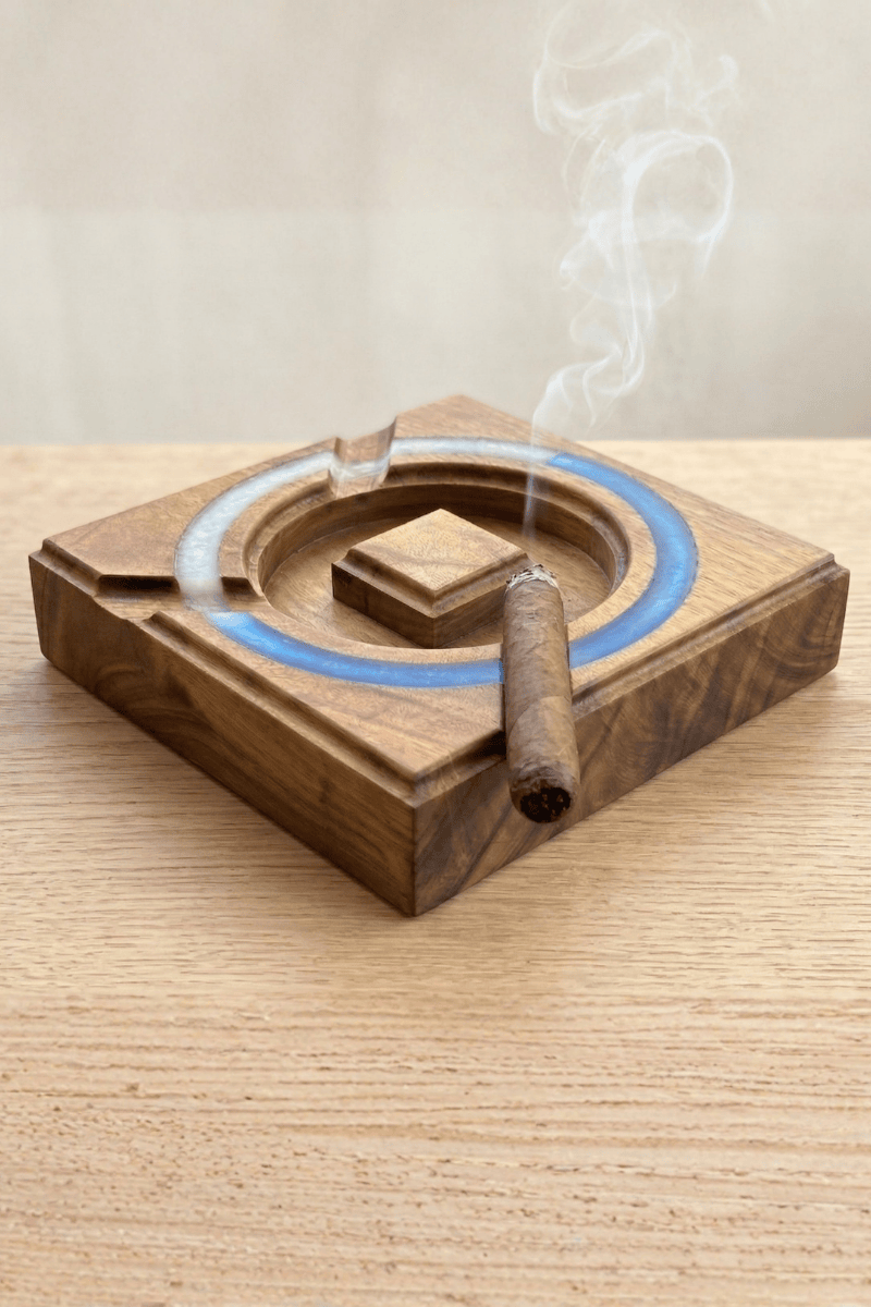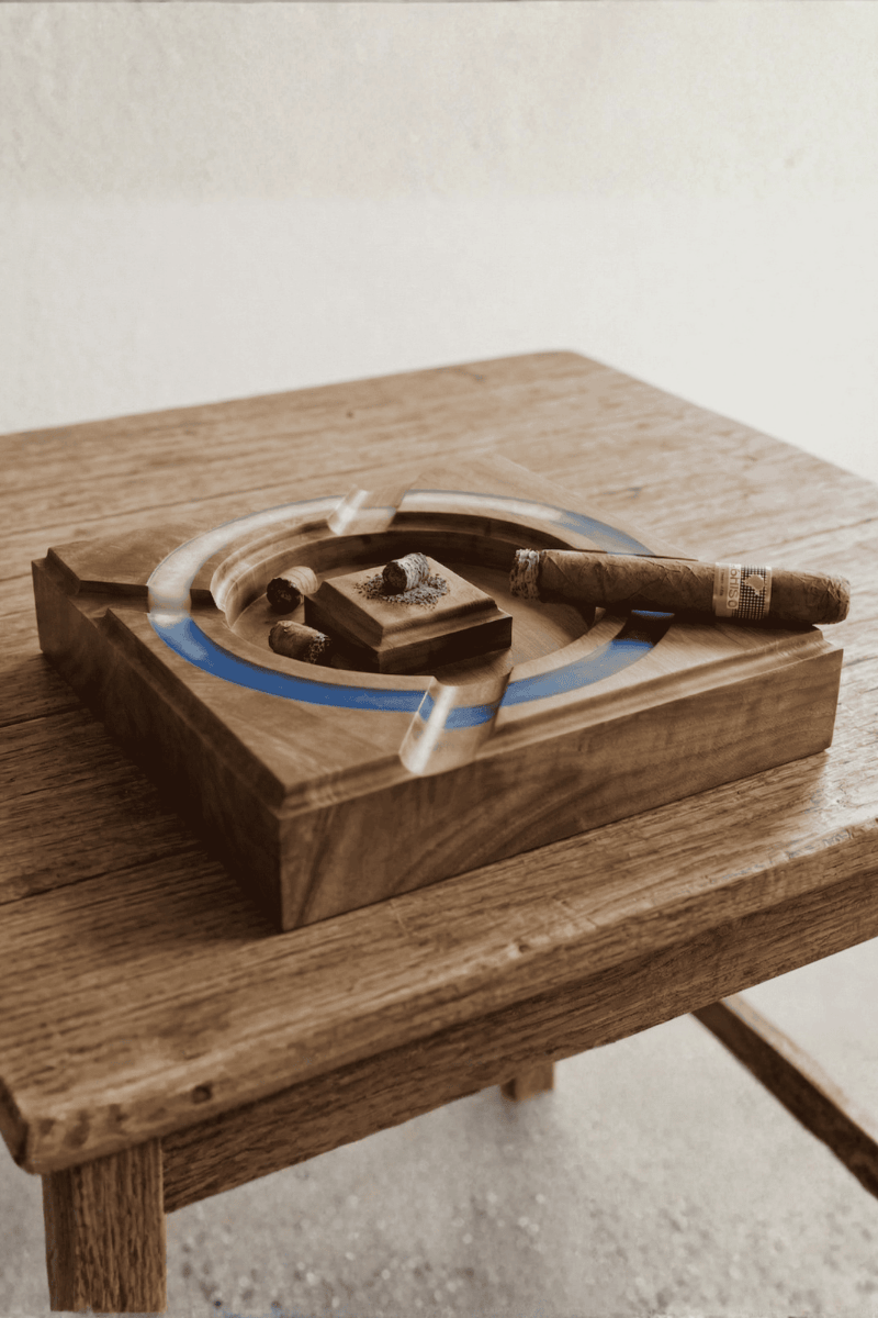 Ceviz ağacının vakur gövdesinden tek parça masif kütük kullanılarak tasarlanan bu kare puro küllüğü, zanaatı ve lüksü aynı çizgide buluşturur. Orta haznesini çevreleyen dairesel mavi-beyaz epoksi hattı, ahşabın doğal hareleriyle modern bir kontrast oluşturarak masanızda sanatsal bir odak noktası yaratır.