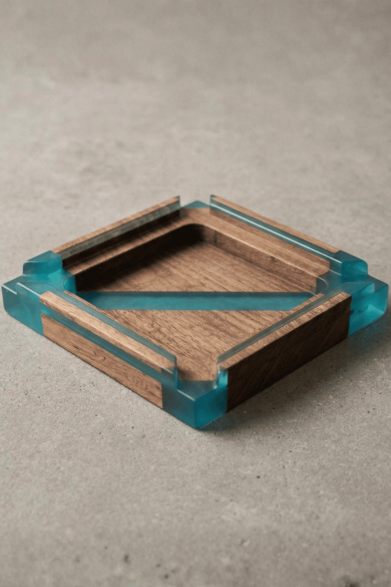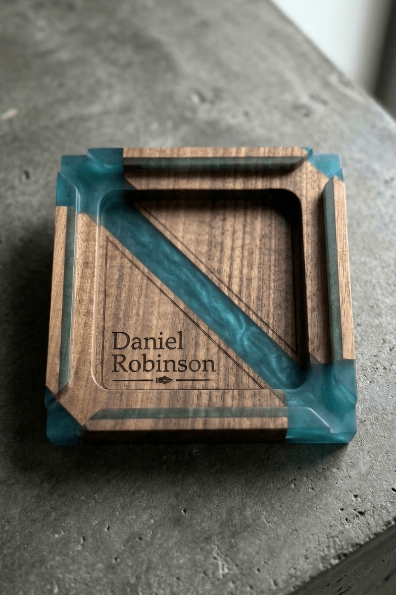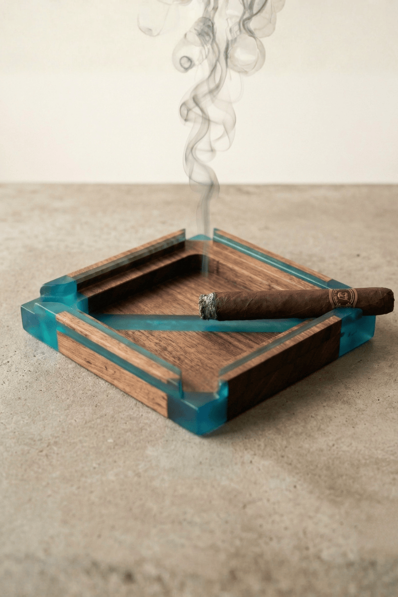 Ceviz ağacının asil ve ağır dokusunu turkuaz epoksinin modern ışıltısıyla buluşturan bu puro küllüğü, keyif anlarınıza eşlik edecek seçkin bir tasarım objesidir. Masif cevizin kendine has koyu tonları, köşe detaylarında ve gövde boyunca ilerleyen canlı epoksi geçişleriyle birleşerek maskülen bir estetik sunar.