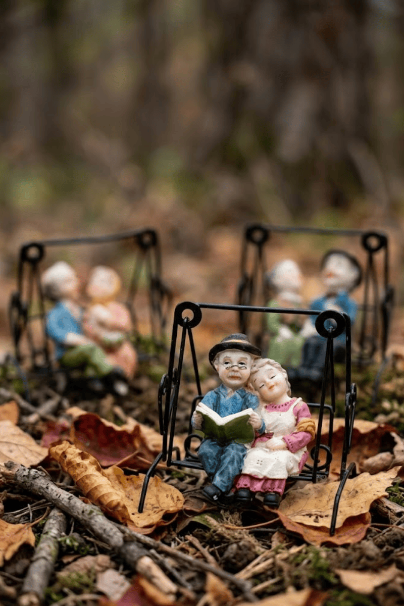 Birlikte yaşlanmanın ve paylaşılan huzurlu anların en zarif temsili olan bu minyatür biblo, poliresin malzemenin detaycı işçiliğiyle hayat buluyor. Ferforje tasarımlı sallanan bir salıncak üzerinde kitap okuyan ve birbirine yaslanan yaşlı çift figürleri, sevginin zaman ötesi bağlılığını evinizin en sıcak köşesine taşıyor.